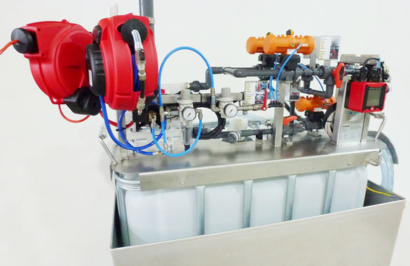 Das System ist ausgestattet mit einem IBC-Tank, Pumpe, pneumatischem Netzanschluss mit Schlauchaufroller, automatische Ventile mit Grundstellung, Mengenzähler, Schlauchhalter.