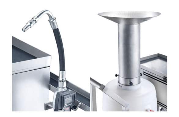 Die Anlage ist mit Vorratsbehälter, Pumpe, Netzkabel zur Energieversorgung, Schlauch und Zapfpistole ausgestattet. Spezialtrichter zur sicheren Entleerung des Getriebeöls werden situativ besprochen und angepasst.