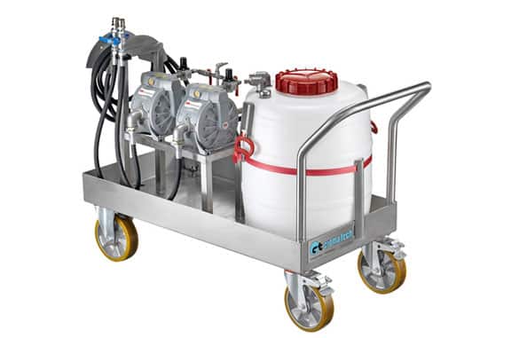 Das System ist ausgestattet mit Schlauchmaterial, zwei Doppelmembranpumpen, Druckreduzierstationen, Auffangbehälter.