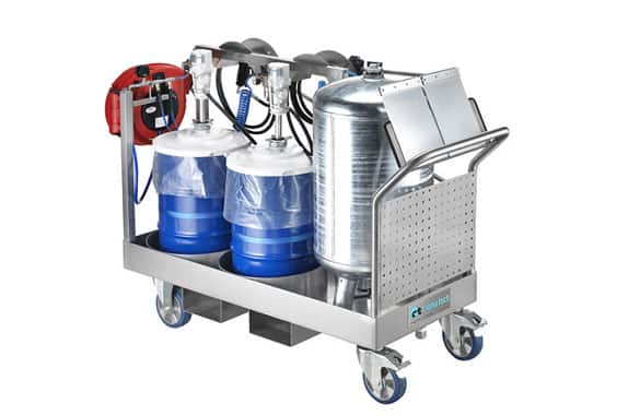 Das mobile Fett-Befüllsystem ist eine fahrbare und sofort betriebsbereite Anlage für den mobilen Einsatz und autarken Betrieb.